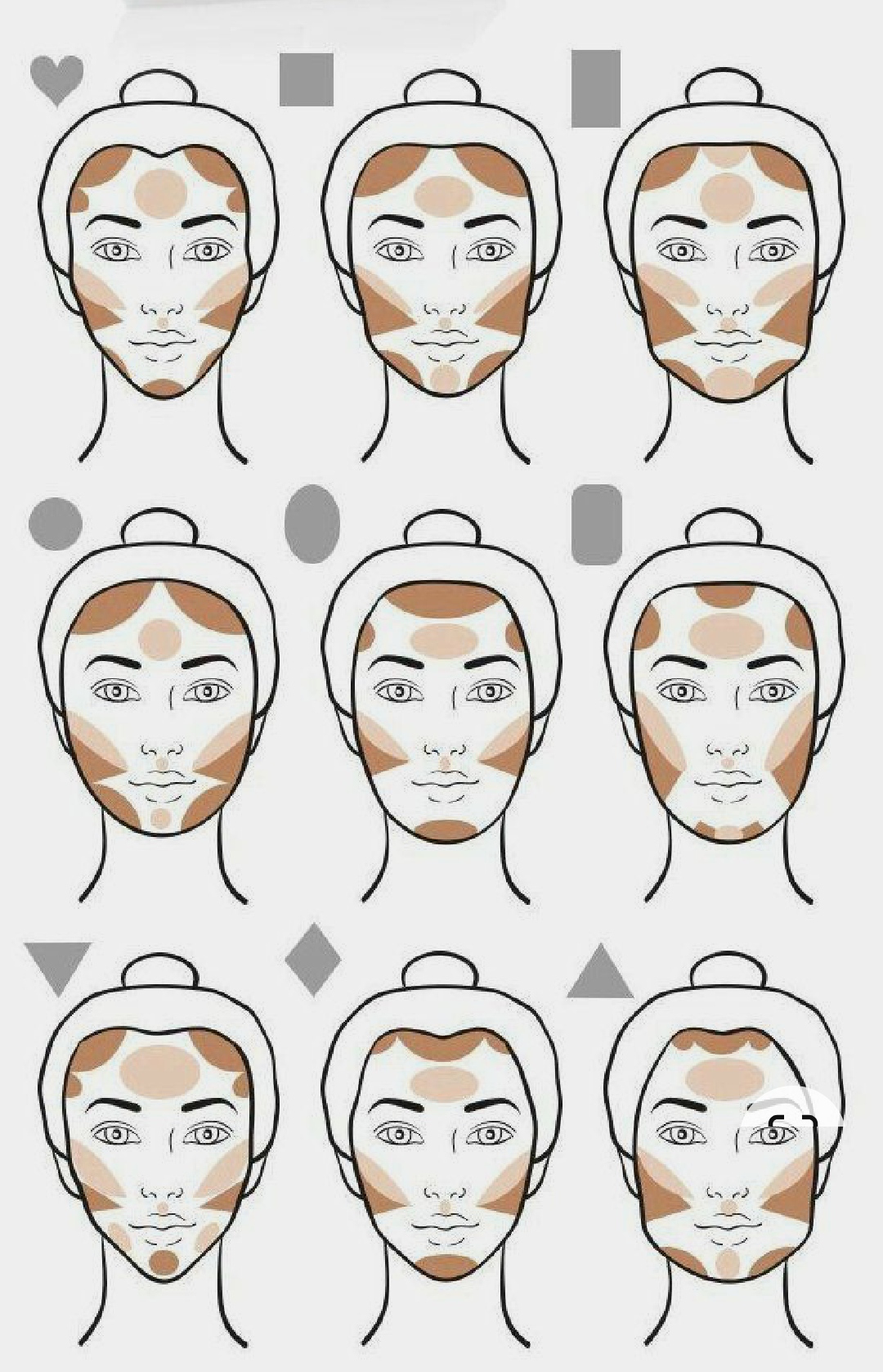 El contorno es algo que todos tienen sus dudas ,¿Cómo se hace? ¿Ay una forma de contorno para cada tipo de cara? Les respondo estas preguntas así: Realmente depende de el formato de tu cara pero el contorno no es solo eso también incluye el corrector para que se ilumine y quedé más natural pero para eso tenés que esfumar muy bien . Por acá les dejo unas fotos para que sepan cómo colocarse el contorno y el corrector para su tipo de cara: